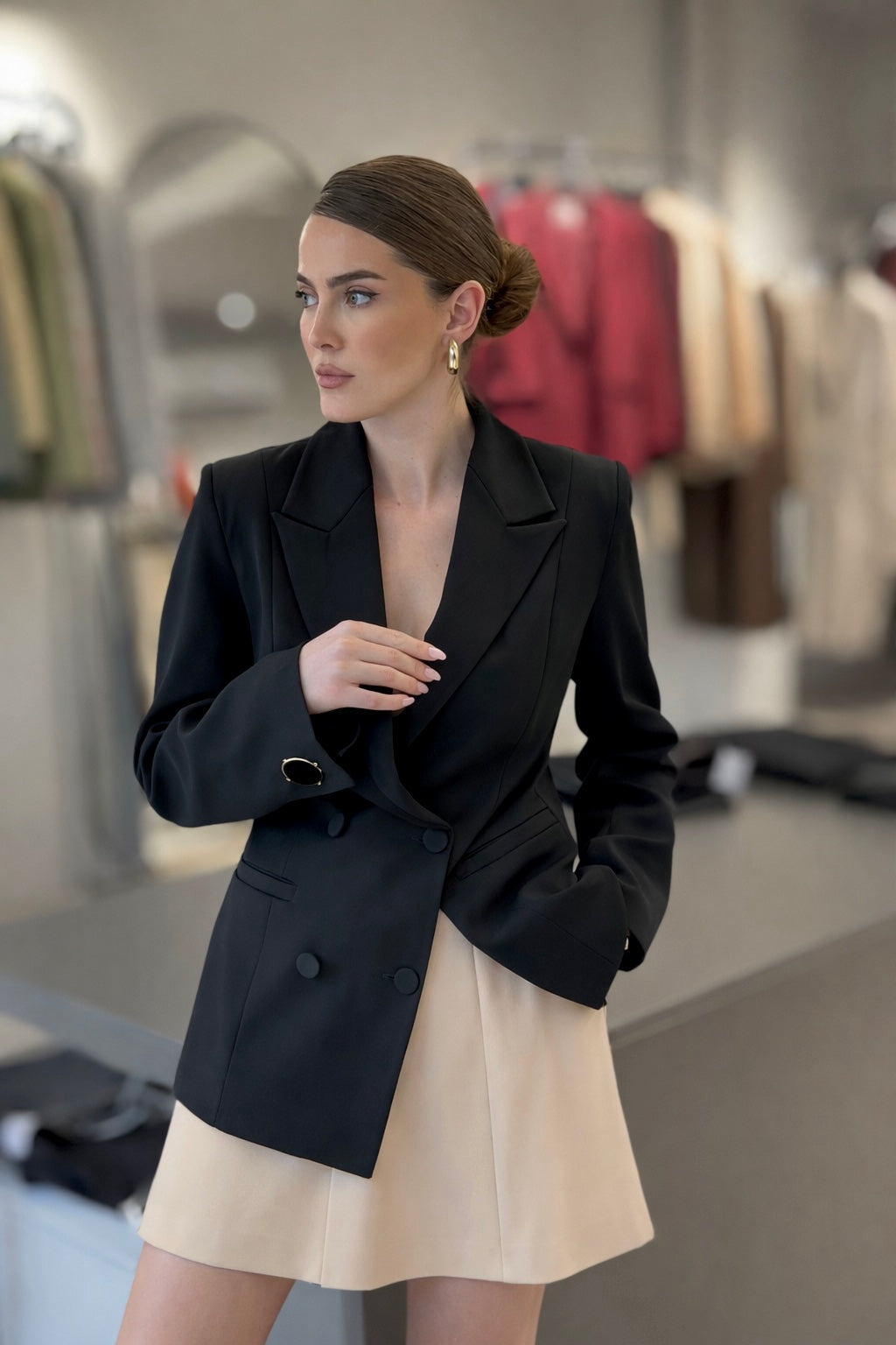 Xhakete me 4 kopsa, stil i drejte me theksim shume te lehte tek beli. Tek mansheta e menges ka nje kopse te vecante.