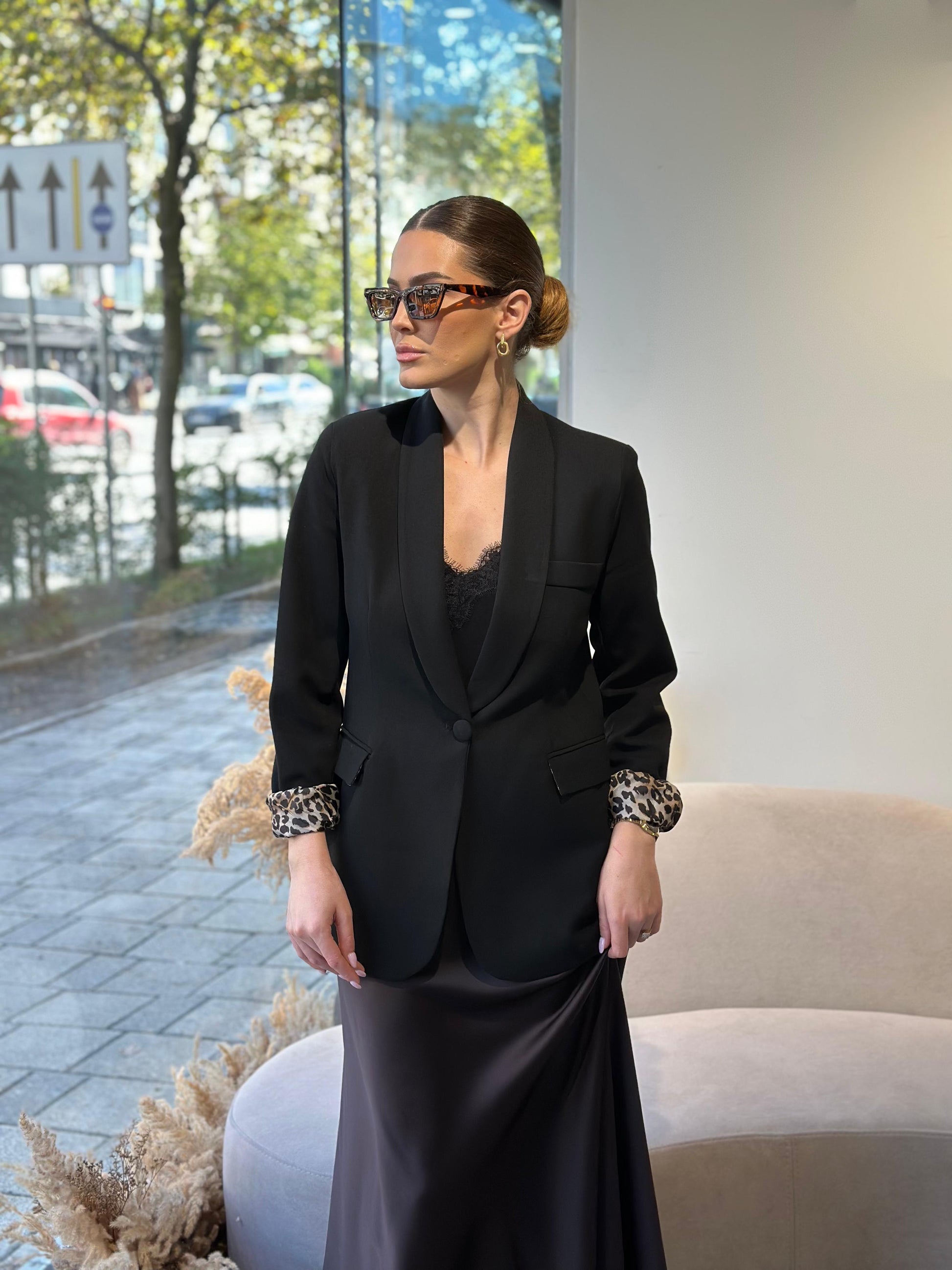 Xhakete e gjate e zeze me prerje fit dhe me nje kopse. Brenda me astar leopard qe bie ne sy kur palosen menget duke i dhene nje prekje moderne xhaketes.